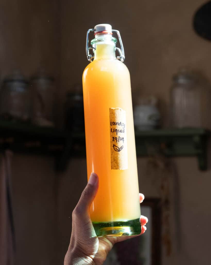 Store the detergent in a bottle or jar, and keep it in the refrigerator if you don’t plan to use it within a week. Use about 1/2 cup of the detergent per load of laundry.